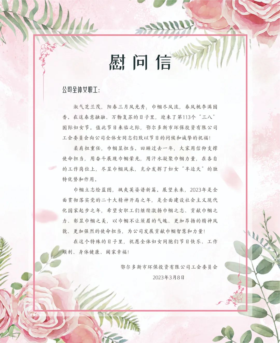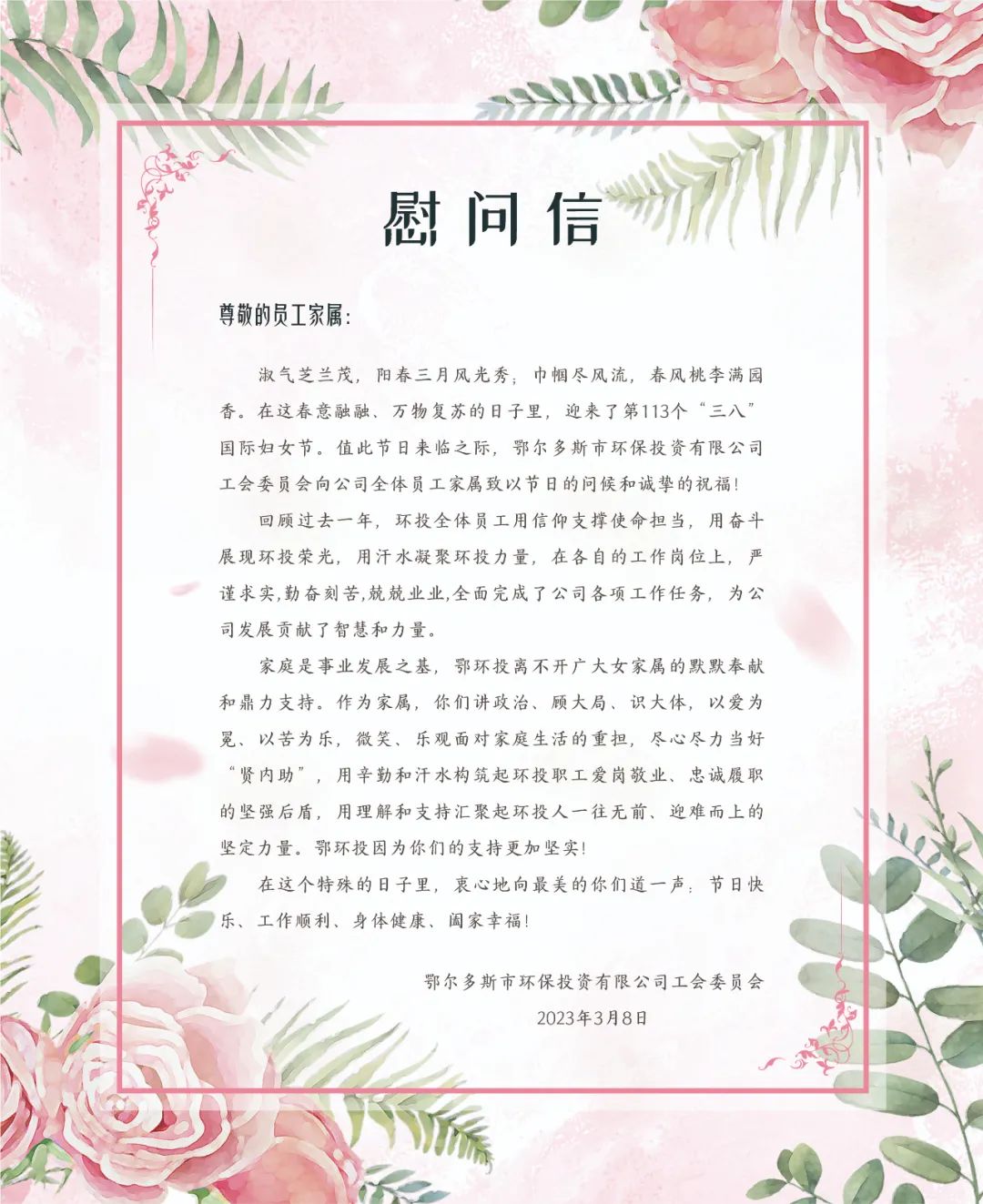 公司工会为全体女职工及男职工家属准备了节日慰问信,致以节日的问候和诚挚的祝福。