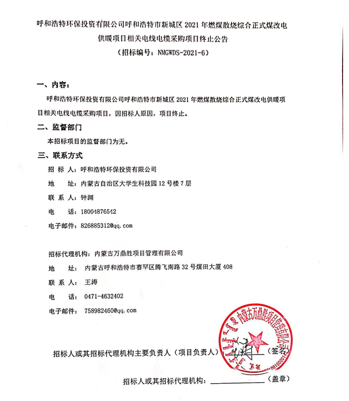 【公告】呼和浩特环保投资有限公司呼和浩特市新城区2021年燃煤散烧综合正式煤改电供暖项目相关电线电缆采购项目终止公告