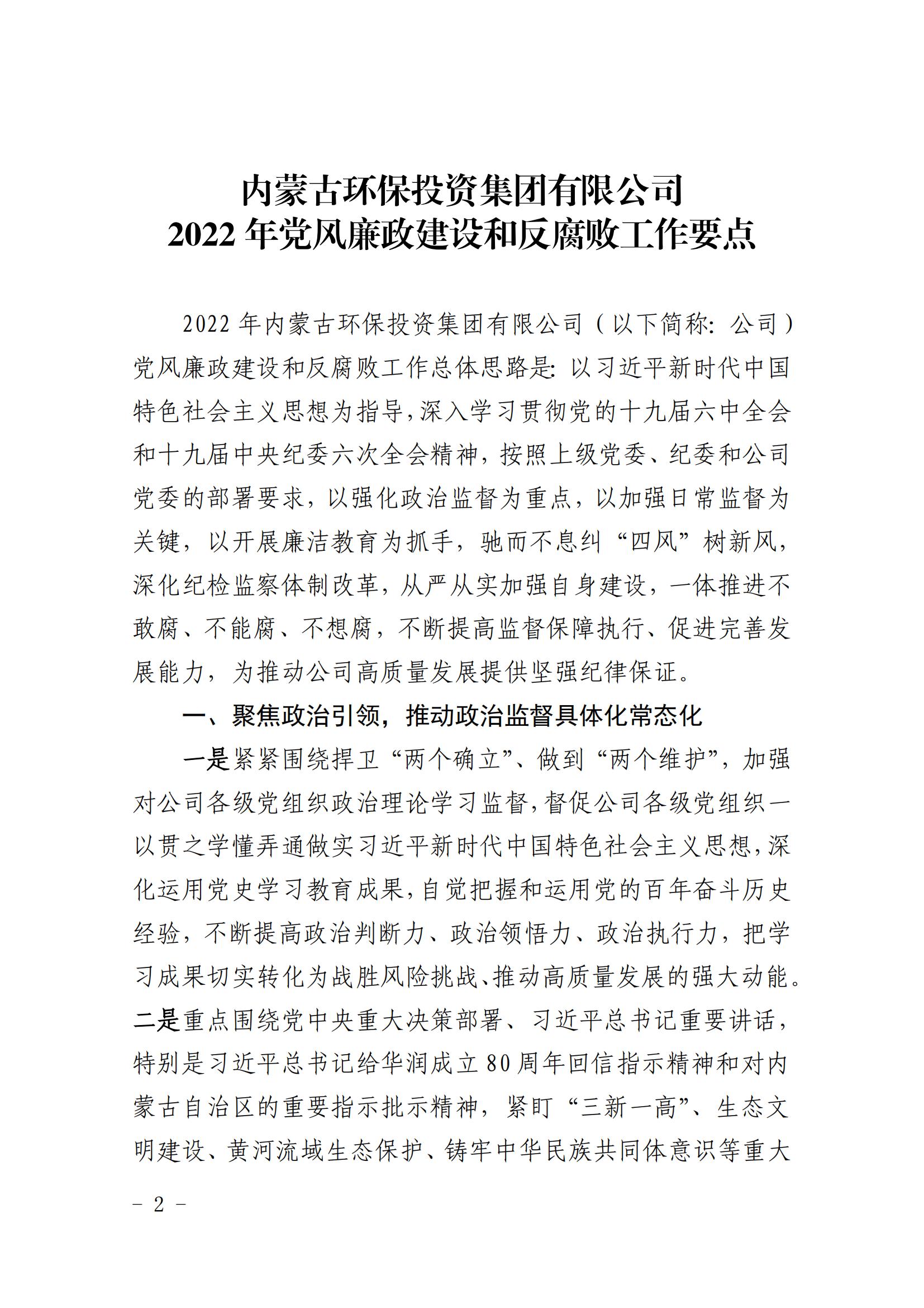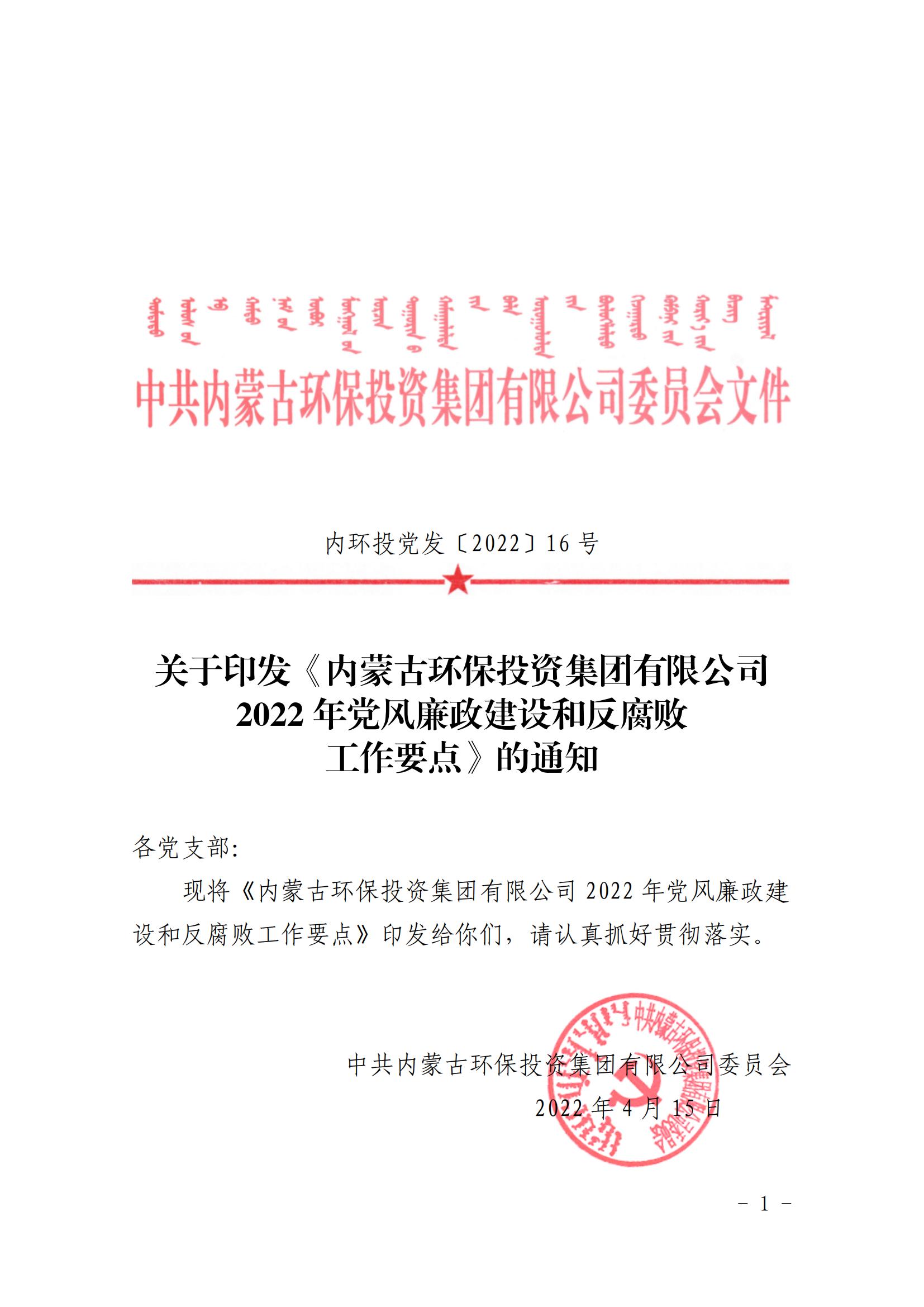 关于印发《内蒙古环保投资集团有限公司2022年党风廉政建设和反腐败工作要点》的通知