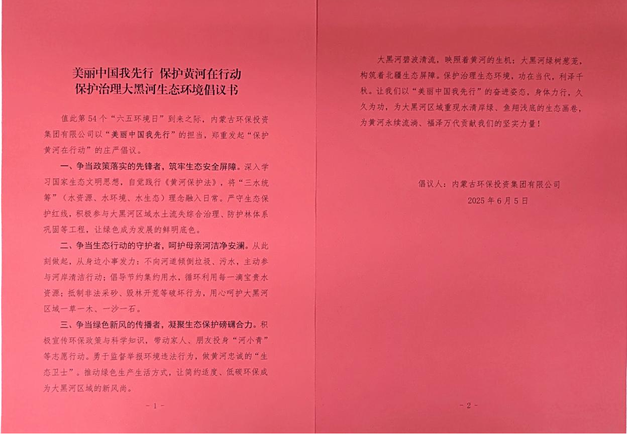 活动最后,内蒙古环投集团郑重发布“保护治理大黑河生态环境倡议书”,倡议内蒙古环投集团全员一起做政策落实的先锋者、做生态行动的守护者、做绿色新风的传播者。