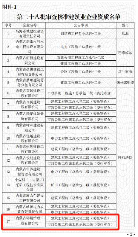 8月2日,内蒙古自治区住房和城乡建设厅发布了关于核准2024年度第二十八批行政审批事项的公告,内蒙古环境治理工程有限公司(以下简称“公司”)获批建筑工程施工总承包二级、市政公用工程施工总承包二级资质,标志着公司在建筑市政领域的综合实力和市场竞争力得到了显著提升。