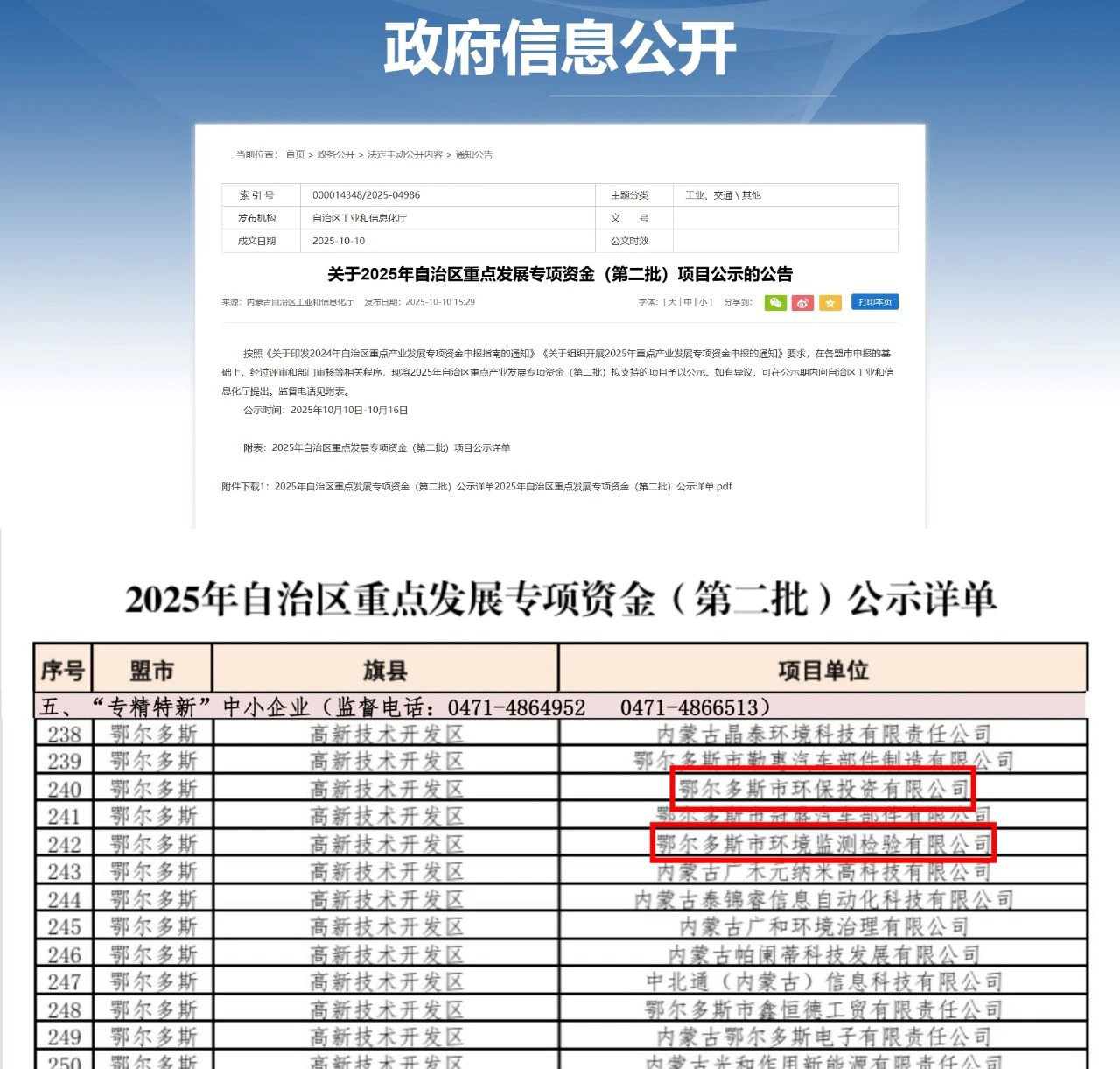10月10日,内蒙古自治区工业和信息化厅公示了2025年自治区重点发展专项资金(第二批)项目名单,鄂尔多斯市环保投资有限公司及其子公司鄂尔多斯市环境监测检验有限公司成功入选“专精特新”中小企业支持类别。