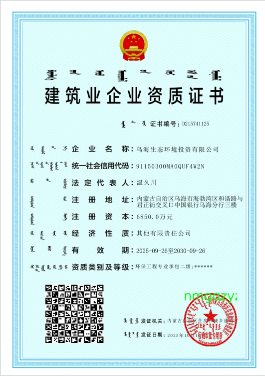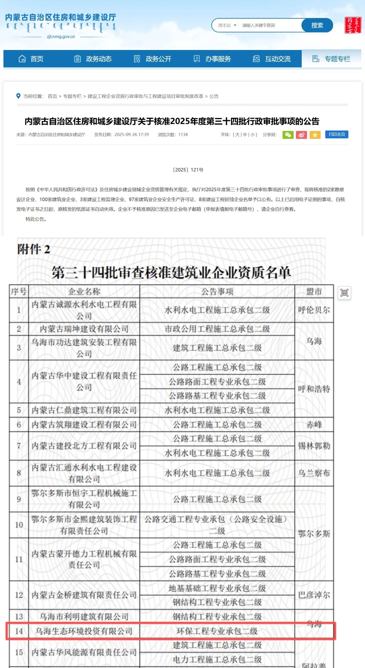 近日,内蒙古自治区住房和城乡建设厅发布了《关于核准2025年度第三十四批行政审批事项的公告》,乌海生态环境投资有限公司成功入围名单,取得环保工程专业承包二级资质。