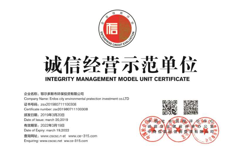 “诚信者,天下之结也”。鄂尔多斯市环投公司从成立之初,就认真贯彻集团公司的决策部署,坚持依法诚信经营,不断提升经营管理水平,打造企业过硬品牌。